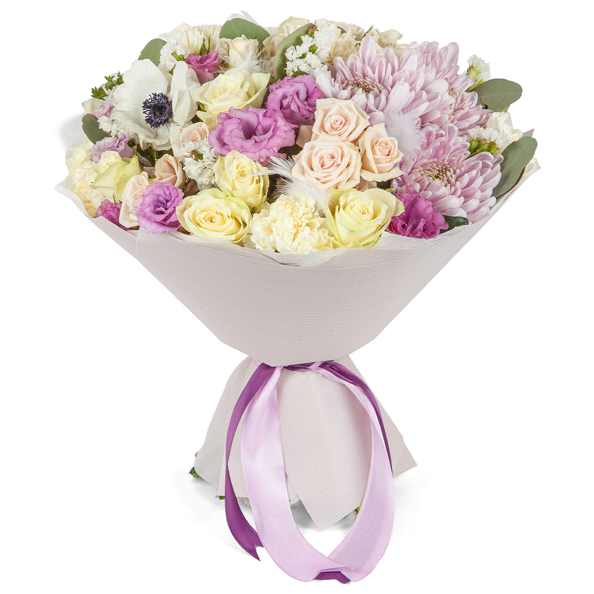 Хризантема одноголовая розовая, роза кустовая розовая, анемон белый, эустома розовая, маттиола белая, эвкалипт. Упаковка (лента, пленка, крафт, сетка, пленка матовая)
