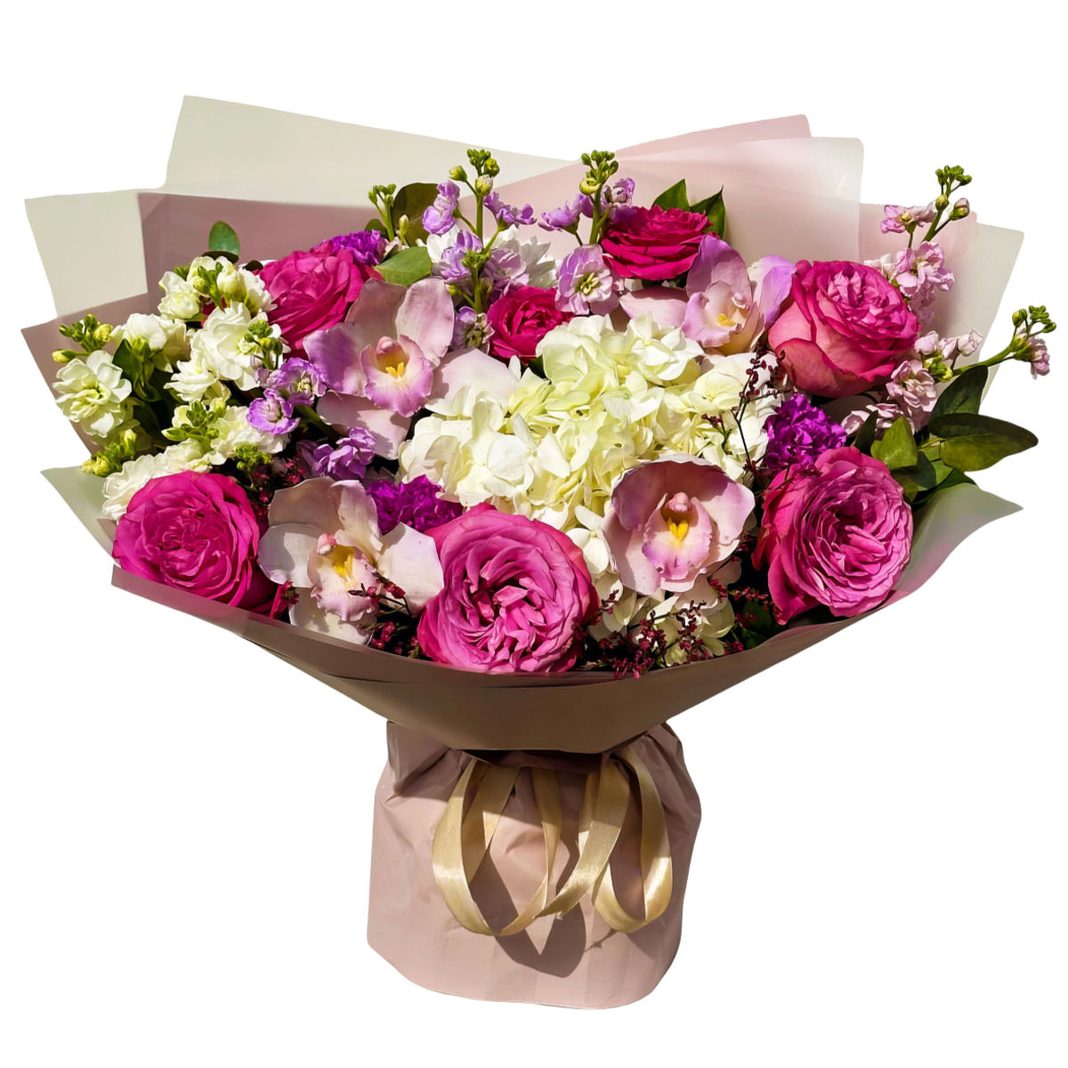Гортензия белая, роза пионовидная одноголовая розовая, маттиола белая, орхидея розовая, зелень. Упаковка (лента, пленка, крафт, сетка, пленка матовая)