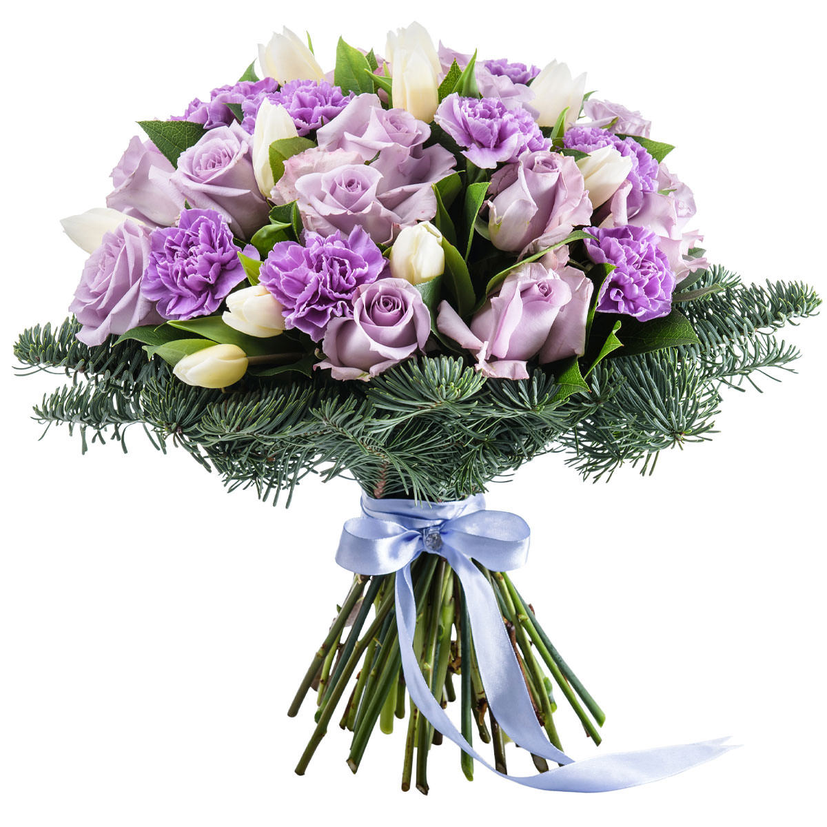 | Состав | Гвоздики, Лавандовые розы, Пихта, Розы, Тюльпаны |