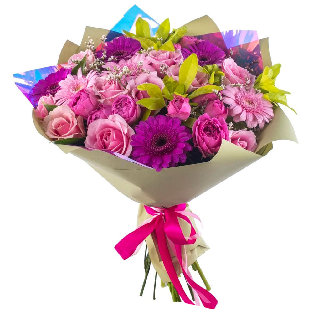 Роза одноголовая розовая, гербера розовая и сиреневая, роза кустовая пионовидная розовая, гипсофила, зелень. Упаковка (лента, пленка, крафт, сетка, пленка матовая)