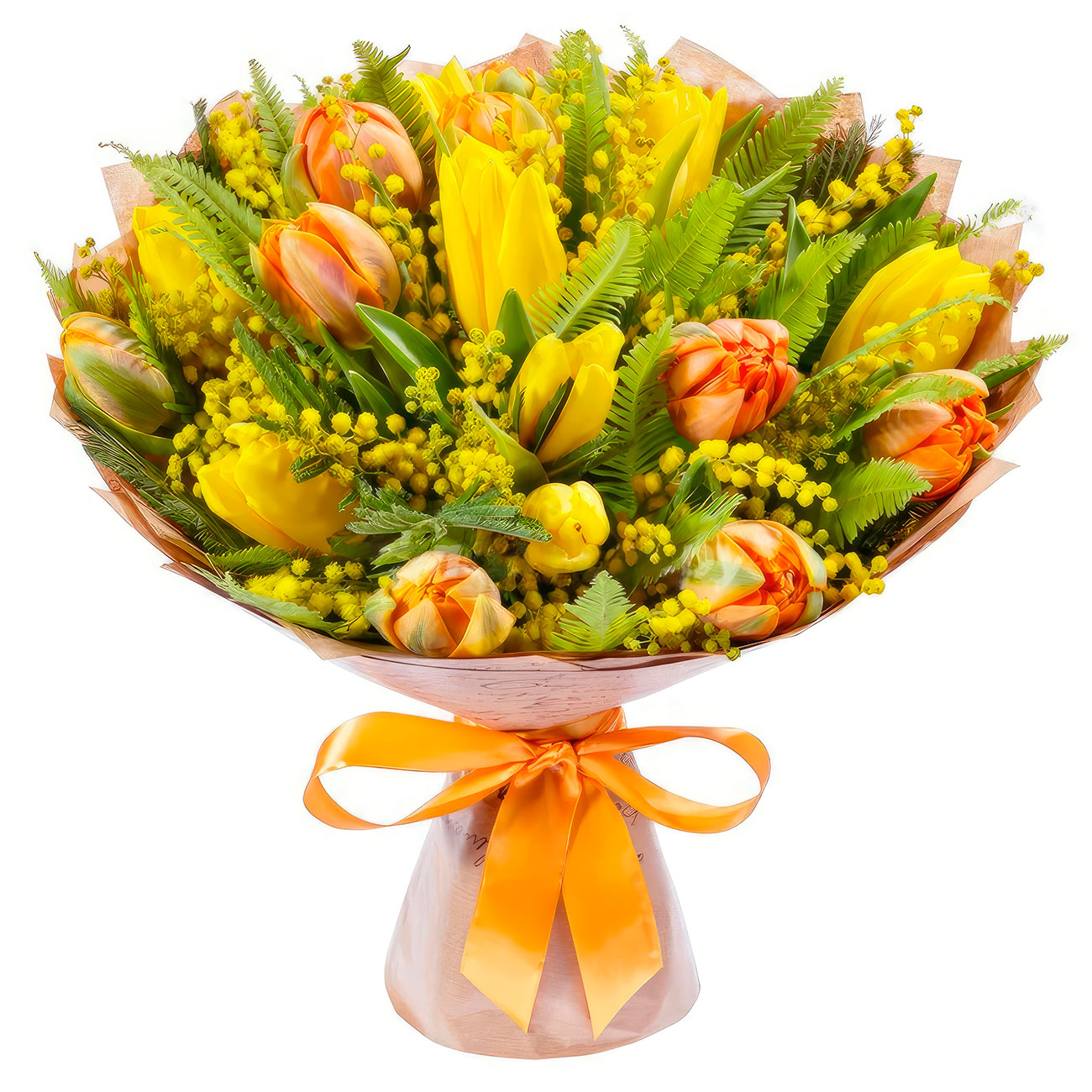 Мимоза, тюльпан желтый и оранжевый, зелень. Упаковка (лента, пленка, крафт, сетка, пленка матовая)