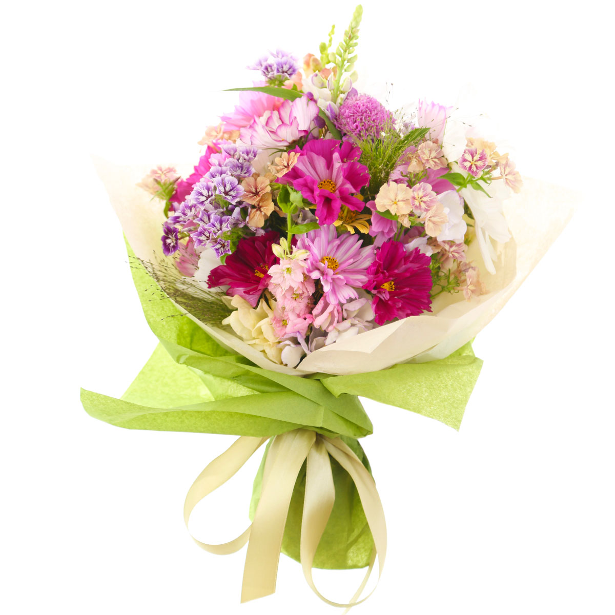 Космея махровая розовая, флокс, маттиола розовая, люпин, зелень. Упаковка (лента, пленка, крафт, сетка, пленка матовая)