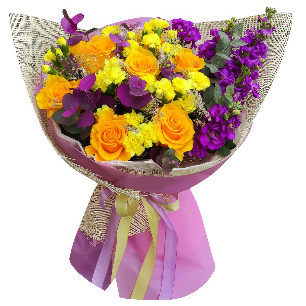 Роза одноголовая оранжевая, маттиола фиолетовая и желтая, эвкалипт. Упаковка (лента, пленка, крафт, сетка, пленка матовая)