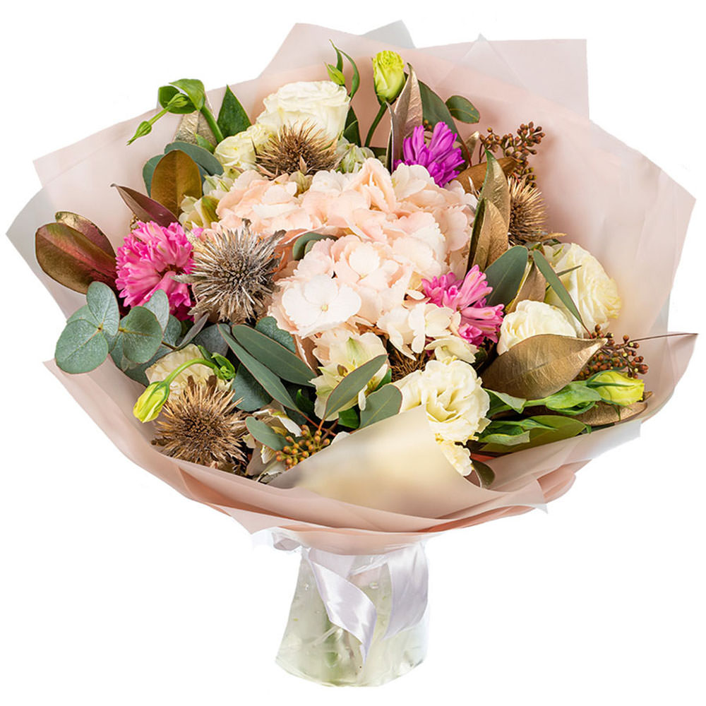 Гортензия нежно-розовая, эустома белая, гиацинт розовый и сиреневый, эрингиум, эвкалипт, зелень. Упаковка (лента, пленка, крафт, сетка, пленка матовая)