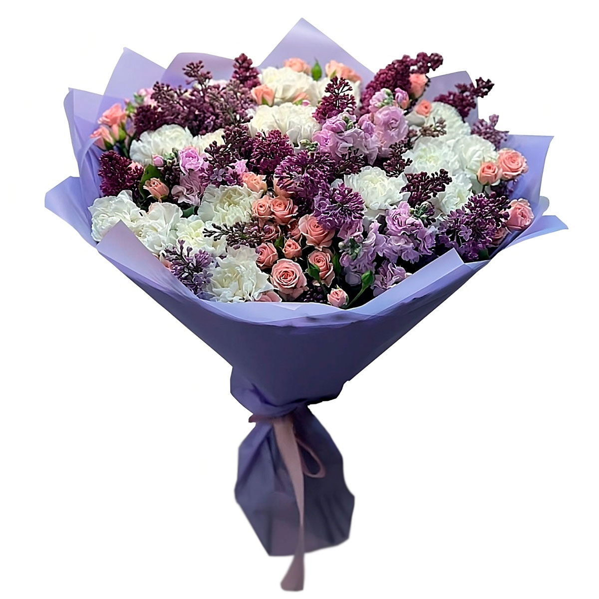 | Состав | Гвоздики, Кустовые розы, Маттиола, Розы, Сирень |