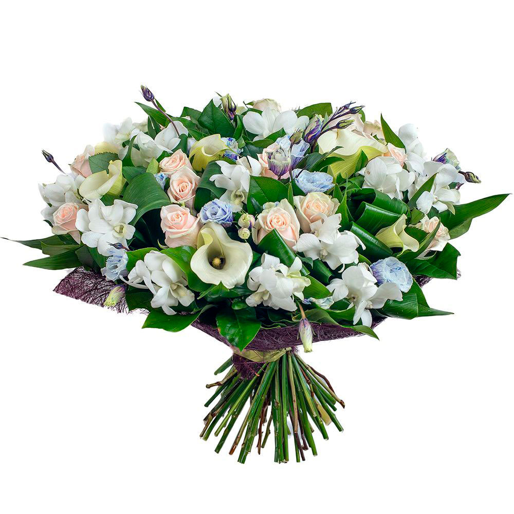 Калла белая, роза кустовая кремовая, аспидистра, маттиола белая, эустома голубая, зелень микс. Упаковка (лента, пленка, крафт, сетка, пленка матовая)