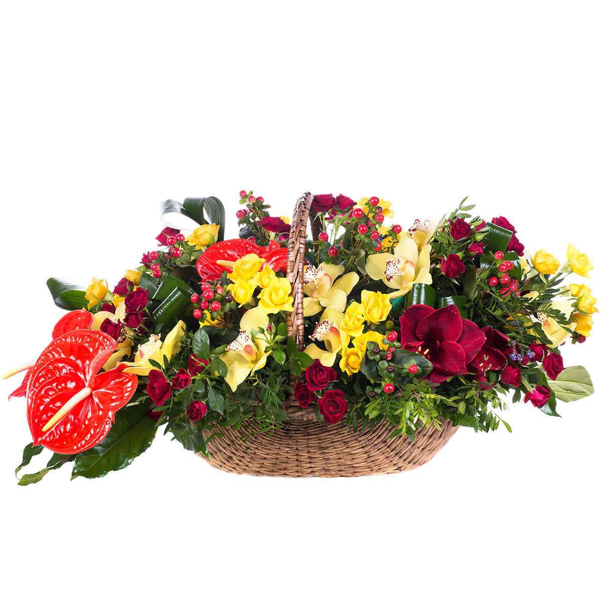 Орхидея красная и желтая, роза кустовая красная и желтая, антуриум, гиперикум, аспидистра. Упаковка (Корзина, оазис, ящик).
