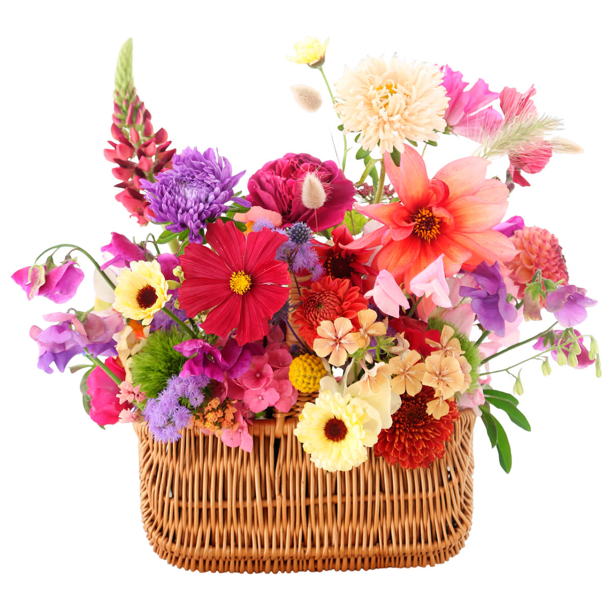 Георгина розовая, люпин оранжевый, космея сенсация, хризантема белая и сиреневая, флокс, роза пионовидная розовая, душистый горошек риппл микс, лагурус, сухоцветы. Упаковка (Корзина, оазис, ящик).