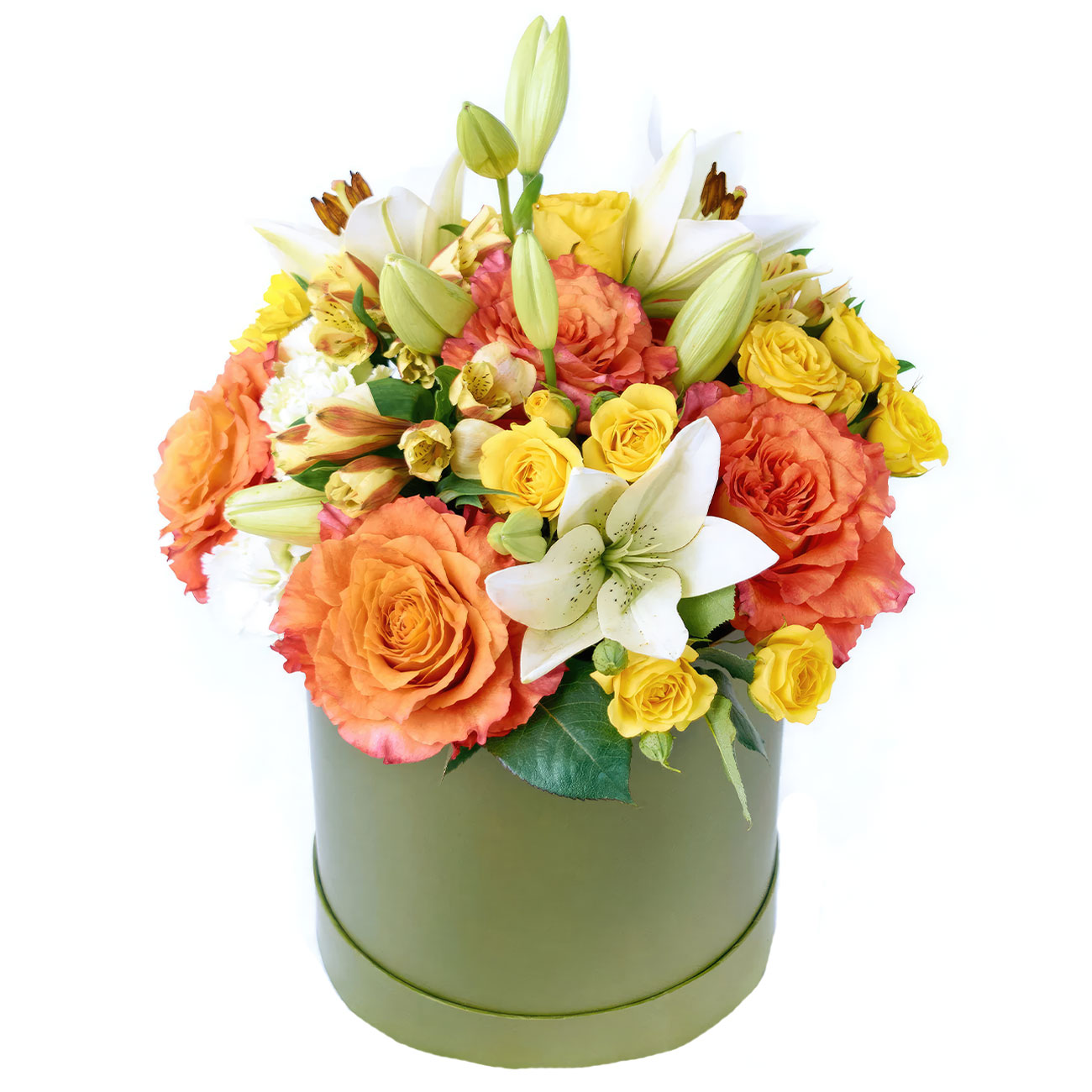 Лилия белая, роза одноголовая оранжевая, альстромерия желтая, роза кустовая желтая, гвоздика белая. Упаковка (шляпная коробка, квадратный бокс, коробка сердце, оазис)