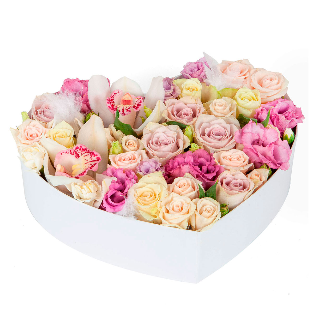 Цветы в коробке «Нежный флер» с доставкой по г Макушино: вы можете заказать букет в интернет-салоне цветов «Флормания» по цене от 3390 руб.
