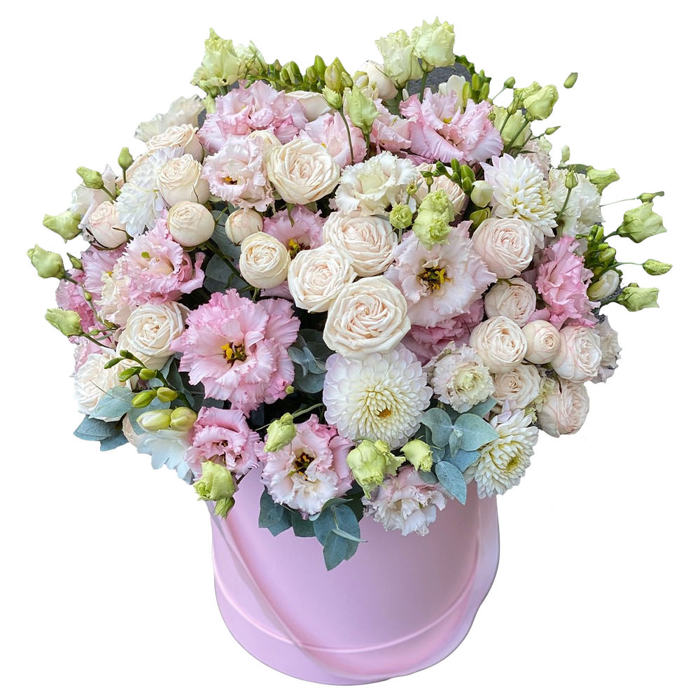 Роза кустовая кремовая, эустома розовая, георгин белый, эвкалипт. Упаковка (шляпная коробка, квадратный бокс, коробка сердце, оазис)