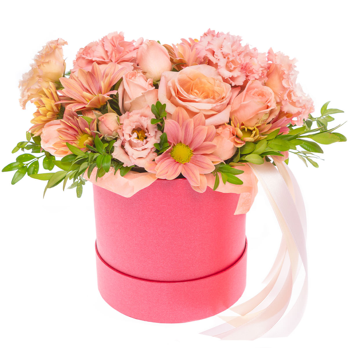 Роза одноголовая персиковая, хризантема кустовая розовая, эустома розовая, зелень. Упаковка (шляпная коробка, квадратный бокс, коробка сердце, оазис)